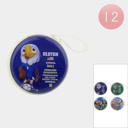 12個 - ワールドカップ サッカーテーマ 動物キャラクタープリント入り丸型ミニコインポーチバッグ